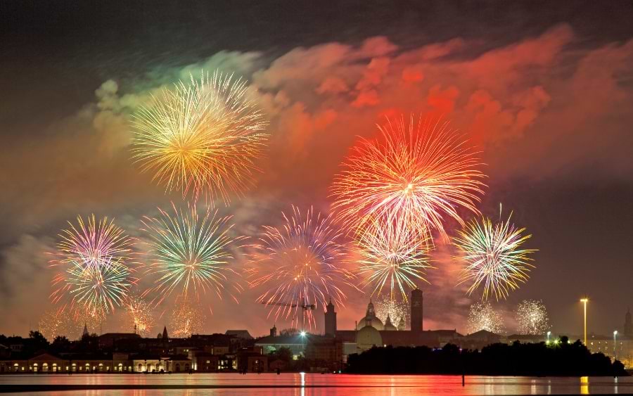 Feiern Sie Silvester in Venedig mit einem atemberaubenden Blick auf das Feuerwerk über der Lagune von San Marco (Piazza San Marco). Hier findet eines der größten Events der Stadt statt, mit Live-Musik, Tanz und einem großen Countdown um Mitternacht. Das Feuerwerk spiegelt sich im Wasser und sorgt für eine spektakuläre Farbshow.
